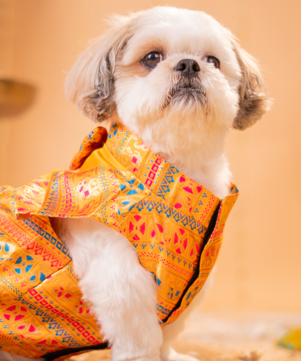 Pack of 2 amazing Dog Kurtas at a steal price. Handcrafted with love and attention to detail, Our Kurtas blends traditional charm with modern comfort for your pup. These outfits are perfect for special occasions or festivals. Made from premium brocade fabric with an inner lining for the dog’s comfort. The bowtie and pockets complete the festive look
